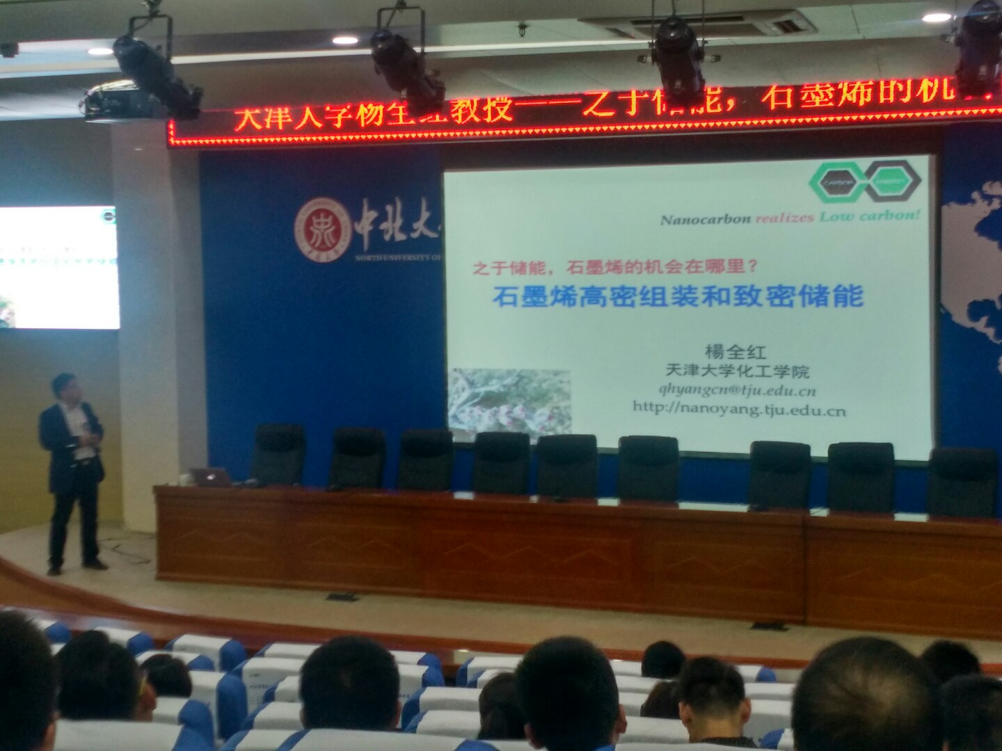 杨全红博士是国家杰出青年科学基金获得者、国务院政府津贴获得者、入选科技部创新人才推进计划“中青年科技创新人才”。从事碳功能纳米材料和新型储能器件研究,获天津市自然科学奖一等奖(排名第一,2013)、天津市科技进步奖一等奖(排名第二,2012)和英国碳素学会“The Brian Kelly Award”(2004)。《Carbon》、《Science China Materials》、《Energy Storage Materials》《Materials Research Express》、《天津大学学报》等10份刊物编委。在Nature Chem、JACS、Adv Mater、Energy Environ Sci、Nano Lett、Phys Rev Lett、ACS Nano、Adv Energy Mater、Adv Funct Mater、Nano Energy等刊物发表SCI论文100余篇,他人引用6000余次。承担973国家重大研究计划课题、国家自然科学基金(杰青、重点、面上)等国家及省部级项目20余项;授权发明专利30余项。讲座围绕着储能、超级电容器、石墨烯等材料领域中最新研究主题展开,杨全红教授为在场的所有师生通过图片、实例等方式介绍了关于石墨烯的理论、研究项目、意义及发展前景,并耐心解答了现场师生的疑问,最后讲座在热烈的掌声中落下帷幕。