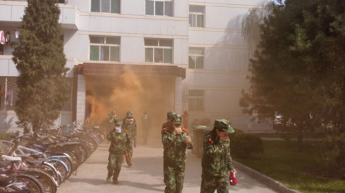 下午1点50分整,随着烟雾弹的点燃和哨声的响起,演练正式开始。各班安全员和班主任立即到达指定岗位,引导楼内学生快速疏散,同学们弯着腰、用湿毛巾等捂住口鼻,沿着指定路线有序撤离到军训集结地,随即各班清点人数,并层层向上级汇报。