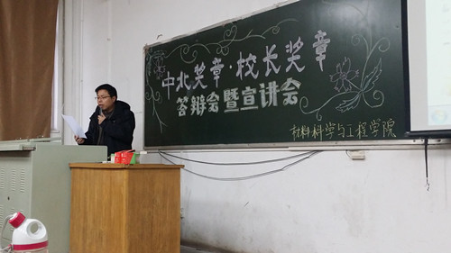 2015年12月10日下午,“中北奖章,校长奖章”候选对象答辩会暨宣讲会于10201教室顺利举行。材料科学与工程学院党委副书记廖海洪老师,李玲副教授、王文生副教授、学生科全体老师及学生代表出席了本次答辩会。