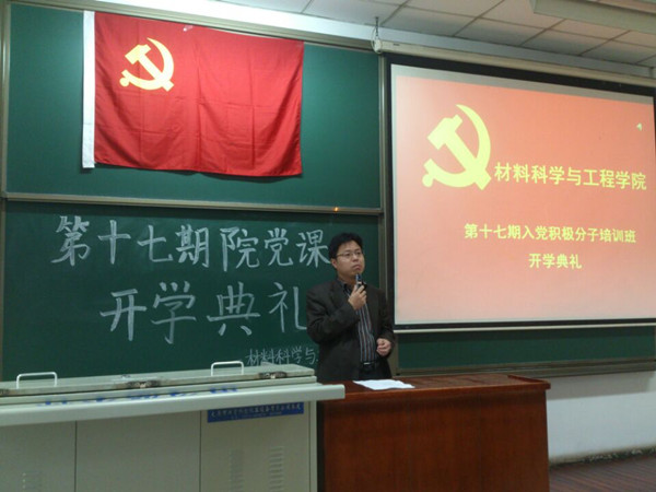2014年5月10日下午2点半,材料科学与工程学院在11405H举行第十七期院党课开学典礼。出席开学典礼的有学院党委副书记廖海洪老师,党支部书记李艳老师,119名入党积极分子参加了此次开学典礼。
