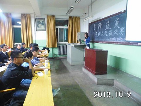 2013年10月9日晚,材料科学与工程学院在01105进行了激烈的“良师益友”主讲人选拔决赛。本次比赛的评委有,材料科学与工程学院学生科郝小军老师,以及团委学生会的各部部长。