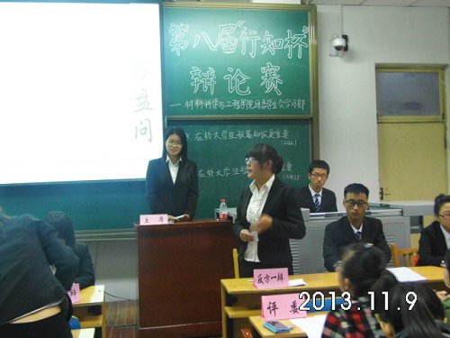 2013年11月9日晚上7点,由材料科学与工程学院学习部举办的第八届“行知杯”辩论赛于11105H,11106H进行,我院实验班对战13030141班,13030342班对战13030242班,比赛异常精彩,现场气氛活跃。