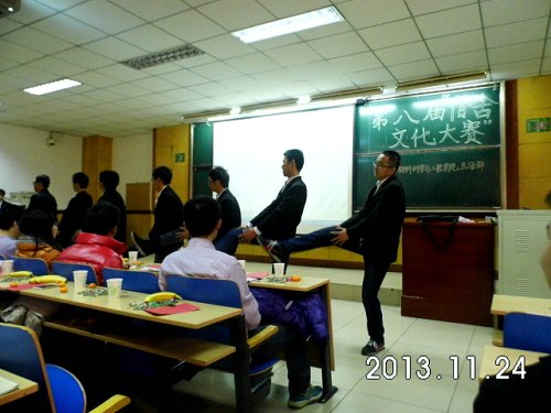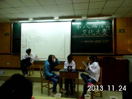 2013年11月24日上午,由材料科学与工程学院生活部主办的宿舍文化大赛在09202H举行。本次大赛中请到的评委与嘉宾有,我院学生科老师郝小军老师,校学生会生活部部长李大驹、副部长赵越,经济与管理学院生活部部长方钰,信息与通信工程学院生活部部长顾灏,理学院生活部部长冯晨,化工与环境学院生活部部长李婉如,机械动力与工程学院生活部部长侯闾,后备军官教育学院生活部部长闫慧斌,我院团委学生会的部长们。大赛参赛者有10#423,12#542,12#541,9#303,6#139,12#125六个宿舍。