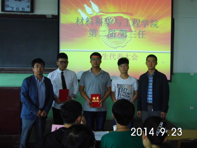 2014年9月22日下午2点,材料科学与工程学院第二届第三任学生换届大会在01205H隆重召开。出席本次会议的领导有校团委副书记魏翀、材料科学与工程学院党委书记侯华,、副书记廖海洪、教学副院长冯再新、李迎春、团委副书记毋登辉、学生科科长郭云霞,以及第二届第三任团委副书记安东同学,主席孙孝文,各位部长,各位投票人。