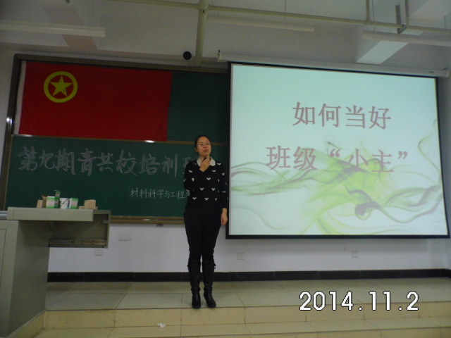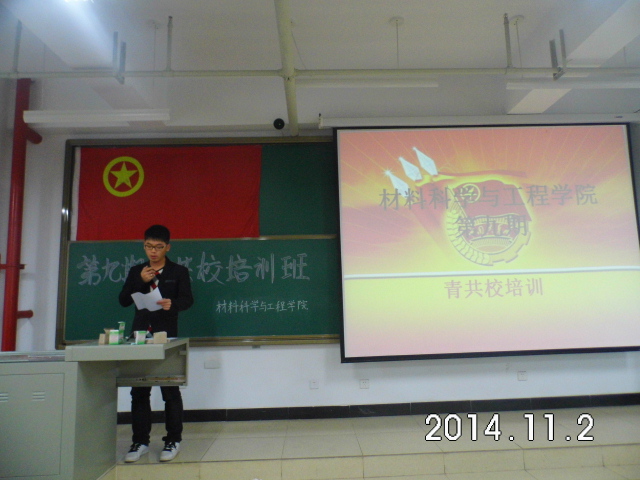 2014年11月2日,材料科学与工程学院组织部在15106H成功举办第九期青共校培训。本次青共校培训为期一天,上午党委书记候华,党委副书记廖海洪,学生科科长郭云霞,团委副书记毋登辉和学生科郝小军老师,到现场指导工作。