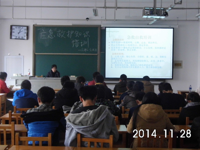 2014年11月28日下午,材料科学与工程学院在15301教室开展应急救护知识培训,大一、大二各班的安全员与应急小分队参加了此次培训。