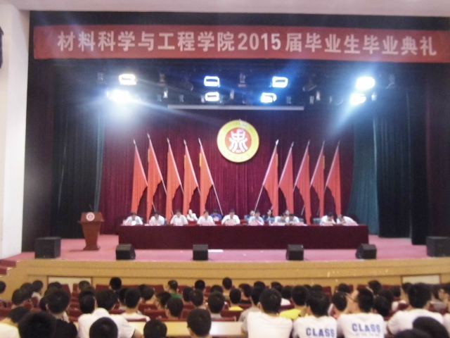 2015年6月30日下午,材料科学与工程学院于科艺苑举行了大四学生的毕业典礼。参加典礼的领导有校党委书记陶功定、院党委书记侯华、院党委副书记廖海洪、副院长冯再新、李迎春、学科部副主任潘保武、韩涛、付一政、张志毅、李志勇、实验中心主任叶云、院科室负责人谢江波、刘富强、徐宏妍、郭云霞、崔利莹、毋登辉、毕业班班主任李艳、刘淑娟。