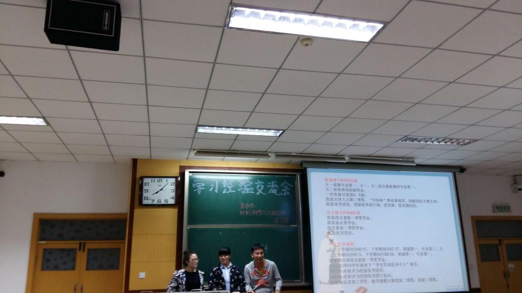 首先由洪世博学长,为大家分享了学习时间、学习方法、学习生活等方面的经验。陈倩倩学姐从培养读书兴趣、学会独立思考、学会总结知识三个角度为大家做了经验介绍。牛敬贝学姐,就各个科目的学习内容和方法向大家做了详细经验交流。随后是问答交流环节。同学们纷纷向三位学姐学长提问,学长学姐热情详细地回答了同学们提出的问题。最后由学习部部长宋陆萍宣布,材料科学与工程学院学习交流会圆满成功,并为交流会做了精彩总结,同时对大一新同学未来的学习生活提出了新的要求和期望。