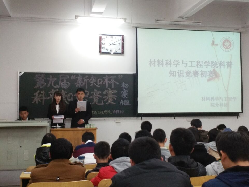 2015年10月25日下午3点,由材料科学与工程学院分科协举办的第九届“新知杯”科普知识竞赛初赛在10301教室顺利进行。此次竞赛旨在让同学们能够将科学精神运用于学习生活中并提高我院学生综合素质。本次到场的嘉宾有我院分科协秘书部部长董振鹏、分科协普及部部长王磊、分科协竞赛部部长范佩奇、记者站站长张书瑜、心情驿站站长武少勇以及体育部部长郭瑞。