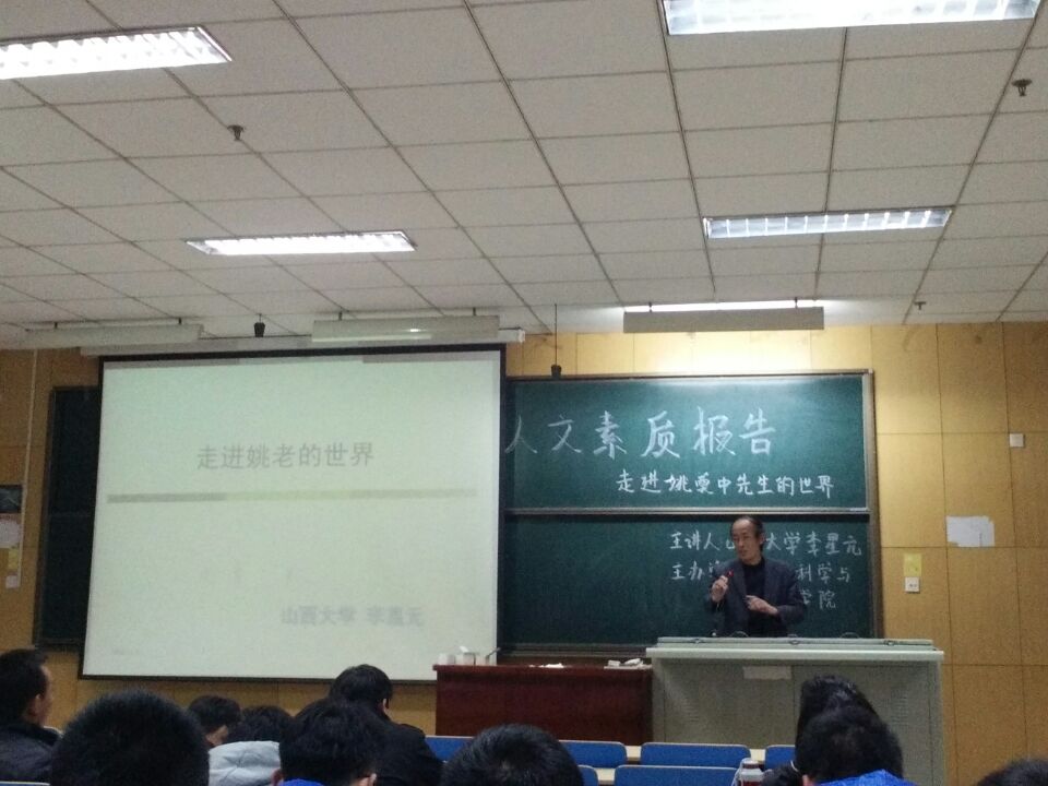 讲座伊始,李星元先生用几张照片简单地介绍了姚老所获得的荣誉,而后又着重用姚老的生活点滴为我们讲述姚老的人格。几张“学府春游”、“寒冬赏雪”、“长城揽车”、“滨河旅游”等照片表现了姚老的闲情雅致;“黄袍加身”、“降为四品”、“布衣百姓”等图片又体现了姚老幽默的文人性格;“戏箸以待”、“砚田耕耘”、“国事在胸”等生活细节图片展现了姚老的待人友善、热爱文学、关注国家发展等优良品格。数十张图片便将姚老的世界完整的呈现了出来,这足以让我对他产生敬佩。