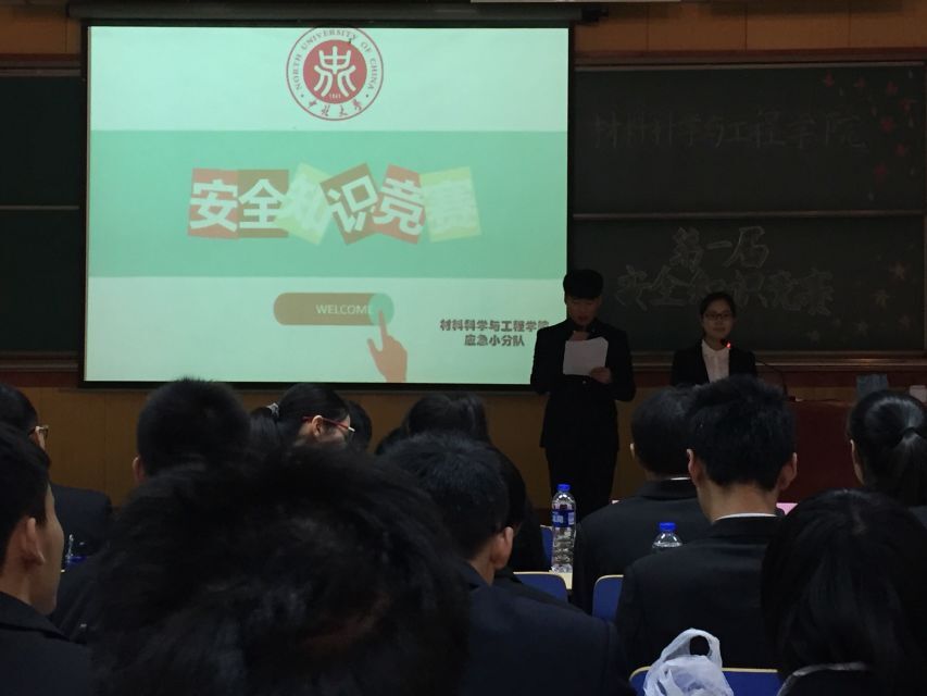 12月6日上午九时,由材料科学与工程学院应急小分队主办的第一届安全知识竞赛决赛在09402H教室圆满举办。本次比赛特邀中北大学校保卫处副处长吴耀金、材料科学与工程学院党委副书记廖海洪老师、学生科郝小军老师担任嘉宾,共有八支队伍参加本次比赛。他们分别是15030143、15030341、15030443、15030542、14030Z01、14030141、14030142、14030541班代表队。