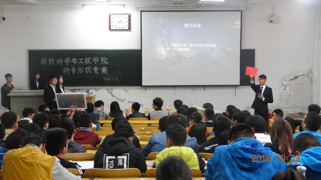 10月23日下午3点,本着推广科普知识,鼓励更多大学生了解科普的材料科学与工程学院科普知识竞赛初赛在院分科协的组织下分A,B,C三组分别在10101H,10102H和10103H三个会场举行,此次竞赛的嘉宾有院团委副书记张莹莹,院学生会副主席以及组织部,学习部等部门的部长。