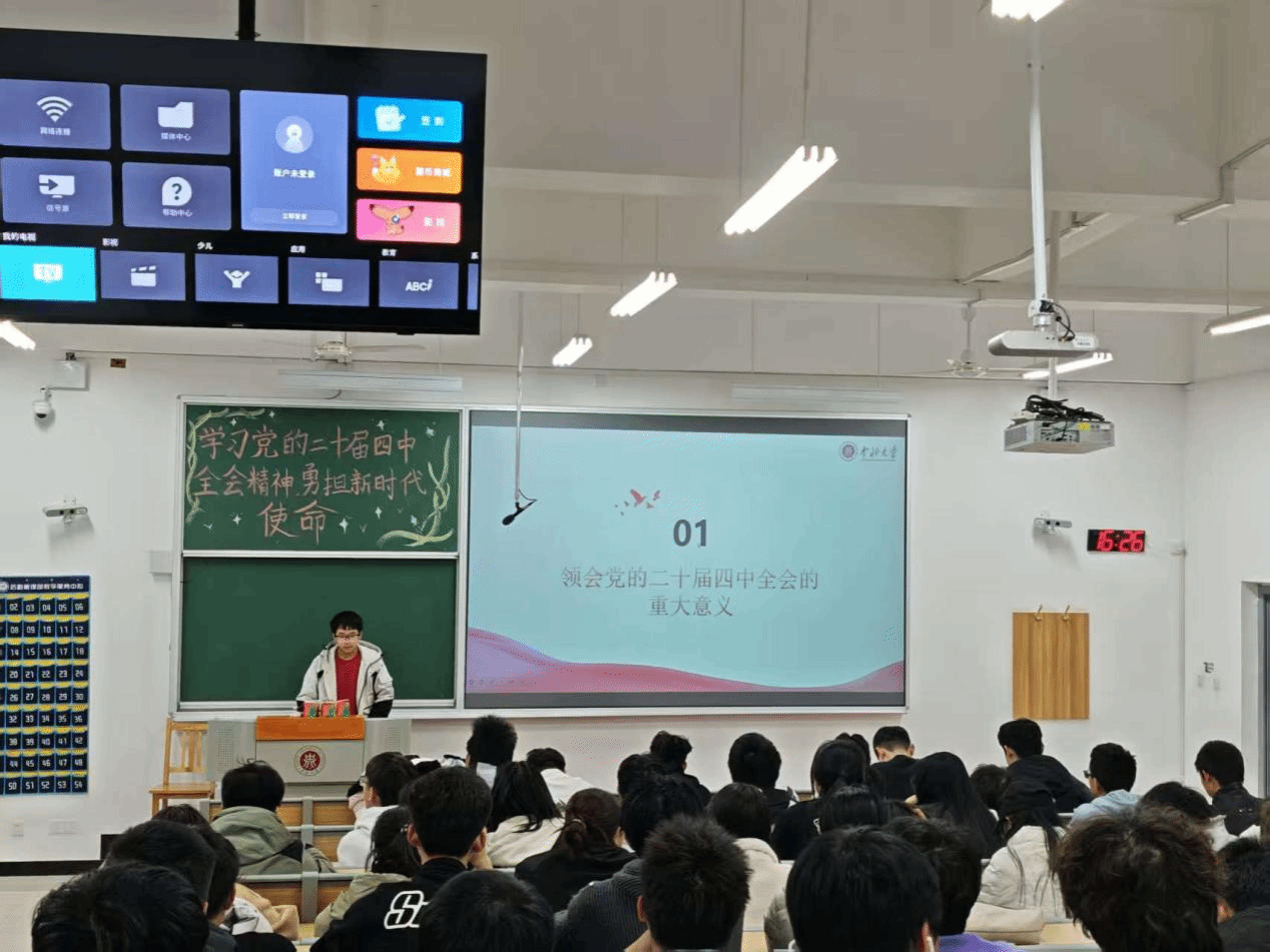 随后,班长王荩琦围绕全会的重大历史意义、核心精神要义、关键部署要求等方面展开系统讲解,重点解读了全会关于科技创新、制造业高质量发展、青年成长成才等与材料专业紧密相关的内容,用通俗易懂的语言将政策理论与学生的专业学习、未来发展相结合,让同学们对全会精神有了更直观、深刻的理解。