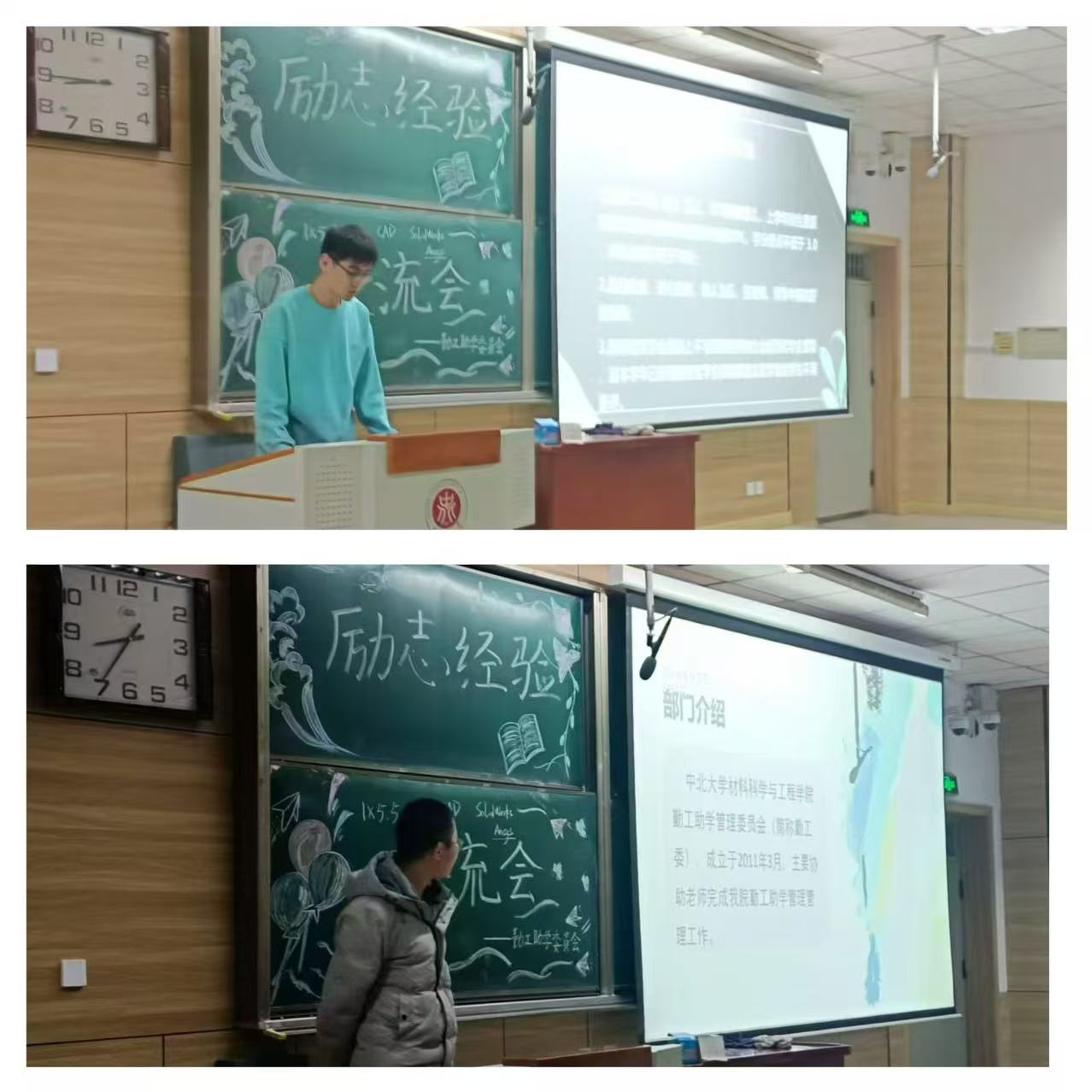 为帮助大一学生进一步明确学习目标,了解家庭经济困难学生的规章制度,让同学们在今后的勤工助学工作中顺利开展,为以后的生活、学习打好基础,材料科学与工程学院勤工委于12月23日19:00在09201H教室举办“励志经验交流会”活动。材料学院优秀学子裴梅羽、李世晶,潘印良、张钊玮做经验分享,勤工委部长赵文愉、屈贵宁、韩振琛出席,本次经验分享会由曲骏睿、祝依颖以主持。