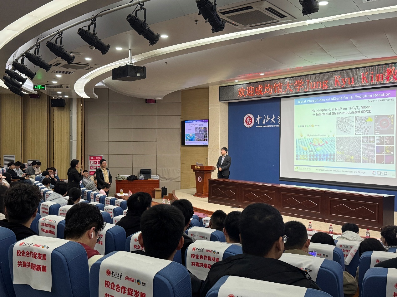2025年4月18日下午15:00,应我院邀请,韩国成均馆大学Jung Kyu Kim教授莅临中北大学瑾瑜国际会议中心学术报告厅,为师生带来题为"Interfacial modulation for solar-assisted electrochemical clean e-fuel conversion"(光-电化学制氢材料的表界面调节改性与动力学研究)的专题学术报告。本次学术活动由国际教育学院院长赵宇宏教授主持,吸引了来自全校的200余名师生参与。