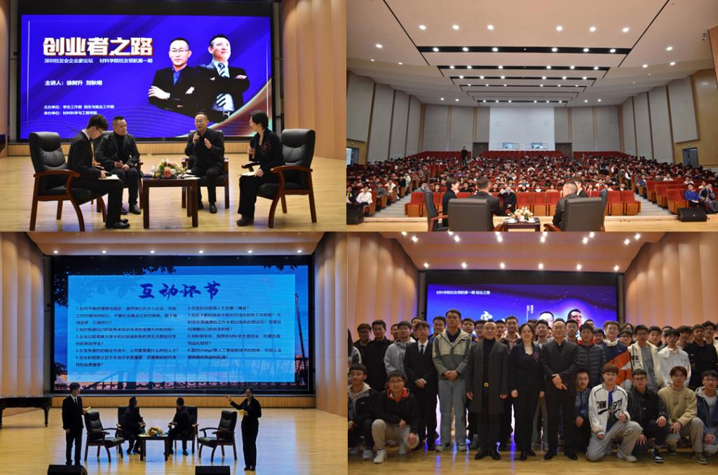仪式之后,材料学院第一期校友论坛“创业者之路”拉开序幕。本场论坛得到了深圳校友会的大力支持,主要对徐树升和刘秋明2位成功企业家进行了访谈。论坛分为校园回忆、毕业之初、创业之路、学长寄语及互动环节五个专题进行,由院党委副书记郭云霞与21级学生任家乐共同主持。访谈内容针对当前在校大学生关注的一些热点问题,如:学生干部工作经历对日后工作和事业发展有什么帮助;对社会偏见“生化环材天坑专业”的看法;如何度过大学初期的迷茫时期;创业中遇到的困难及大学毕业生创业应具备的条件;如何定义成功等,针对这一系列问题,两位校友结合自身的亲身经历与同学们分享观点,交流经验,为学弟学妹们答疑解惑,也给即将步入社会的毕业生更快更好的迈向人生新阶段“职”引未来。徐董事长指出,作为学生一定好好学习,多读书多思考,不断精进自己。刘董事长强调,人最大的敌人是自己的惰性,同学们要勇于挑战自己,掌握过硬本领,才能驰骋未来。
