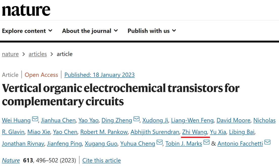 2023年1月19日,国际顶级综合性学术期刊《Nature》发表了我院王智教授参与完成的研究论文“Vertical organic electrochemical transistors for complementary circuits” (Nature 613, 496–502 (2023). https://doi.org/10.1038/s41586-022-05592-2)。该研究由我校与电子科技大学、美国西北大学、云南大学、浙江大学等高校合作完成,其中王智教授主要负责部分半导体分子的设计与合成工作。