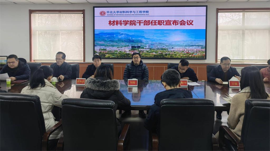 2024年2月27日上午,材料科学与工程学院在二层大会议室召开了干部任职宣布会议,会议由院党委书记廖海洪主持,中北大学副校长刘俊、校党委组织部部长李俊华、学院全体院领导、系主任、科级干部参加了此次会议。
