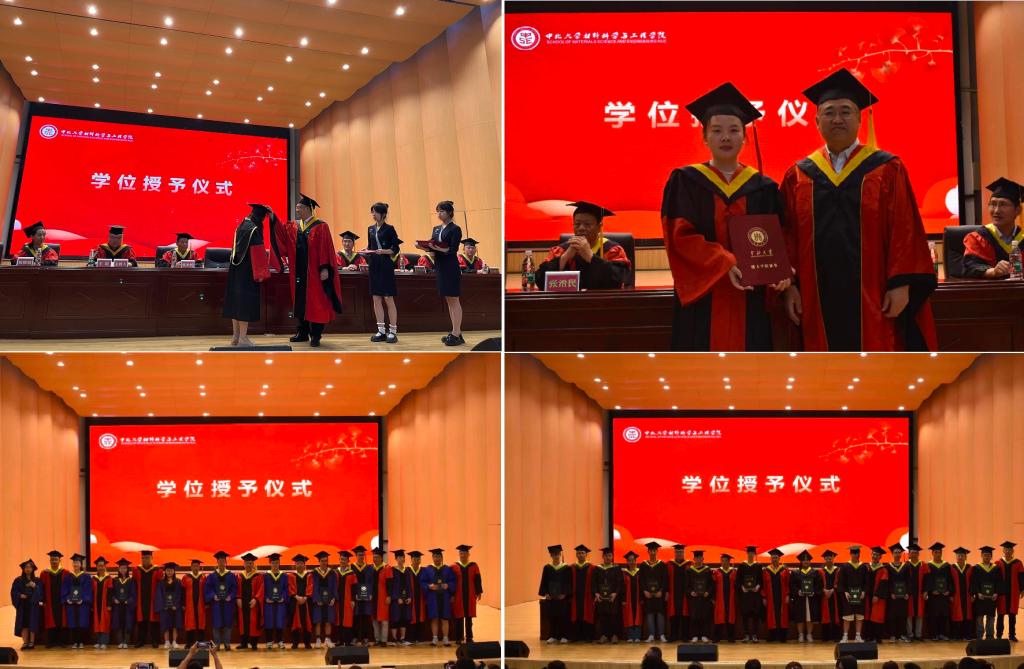 副院长王超宣读《关于授予中北大学材料科学与工程学院2024届毕业生学位的决定》。学院学位评定分委会主任王强院长为博士毕业生拨穗并授予学位证书,硕士和本科毕业生依次上台,由主席台嘉宾为其颁发学位证书。