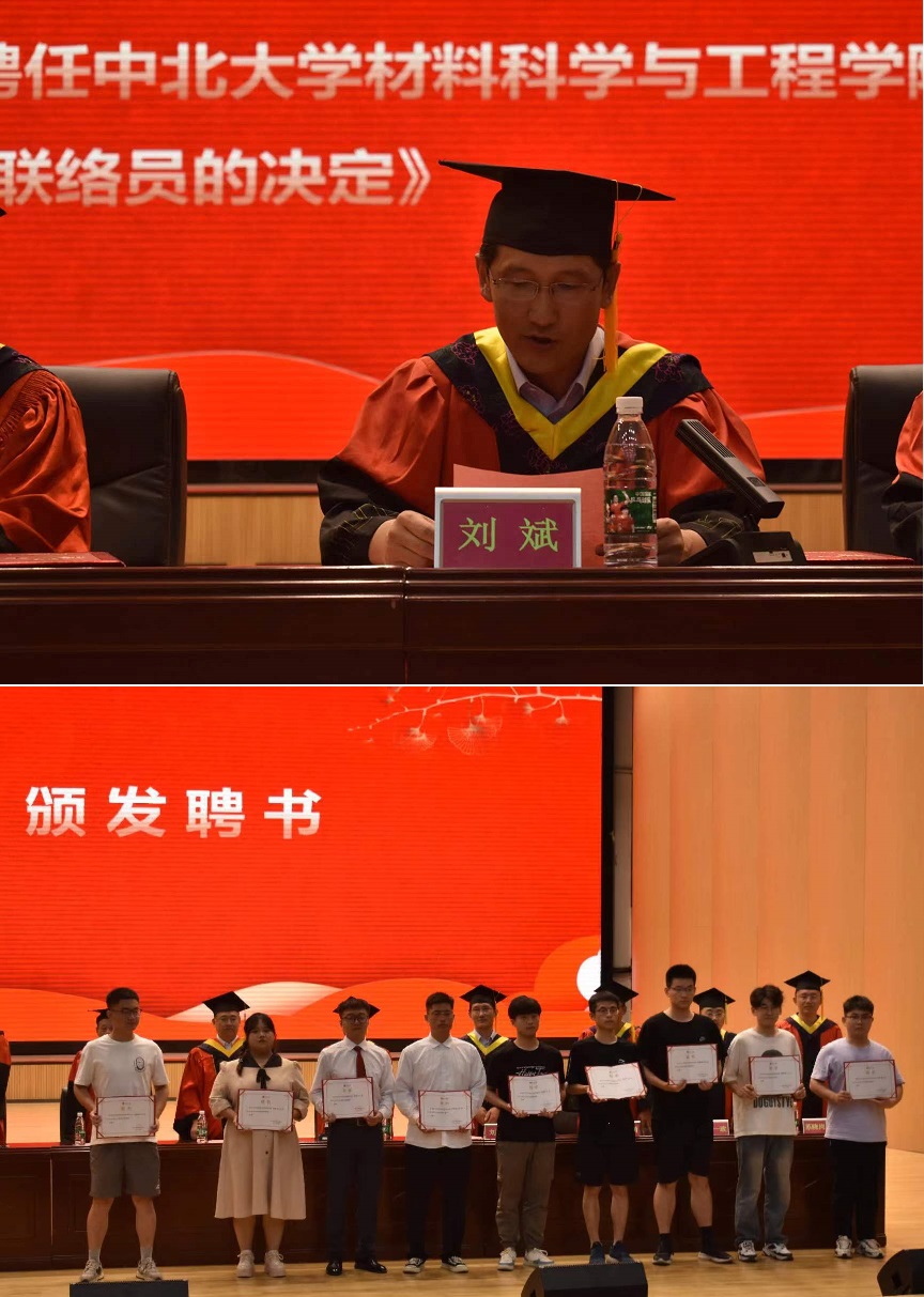 副院长刘斌宣读《关于聘任中北大学材料科学与工程学院2024届校友联络员的决定》,主席台嘉宾为2024届校友联络员颁发聘书。希望各位校友联络员积极主动开展与母校的联系工作,共同促进学校与学院的发展,为母校与校友之间搭建起更宽更广的桥梁。
