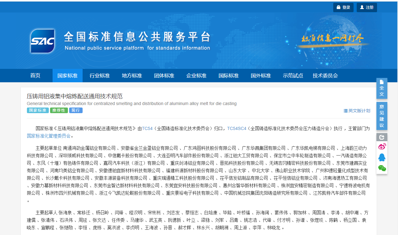 日前,由TC54(全国铸造标准化技术委员会)归口,TC54SC4(全国铸造标准化技术委员会压力铸造分会)执行,我院金属凝固控制与精确成形山西省重点实验室白培康教授、张文达副教授等参与编制、产学研战略合作单位南通鸿劲金属铝业有限公司牵头编制的国家标准《压铸用铝液集中熔炼配送通用技术规范》(GB/T 43920-2024)正式发布,于2024年4月25日正式实施,主管部门为国家标准化管理委员会。