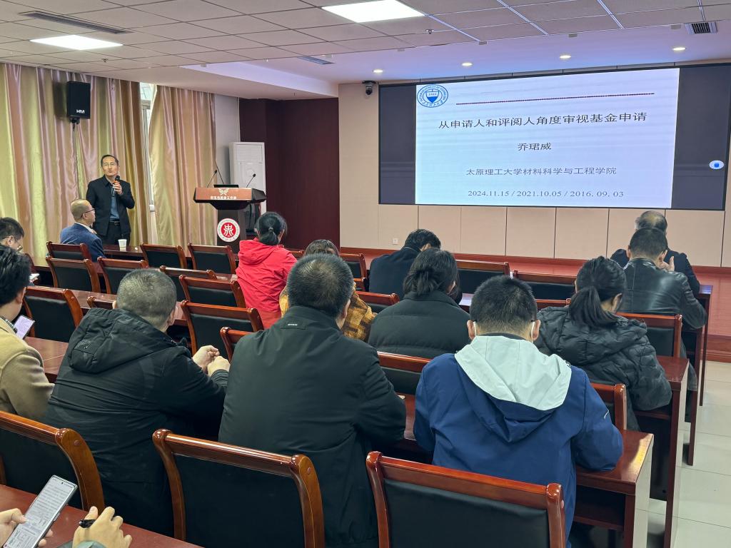 2024年11月15日下午,材料科学与工程学院在11号楼7层报告厅召开了2025年国家自然科学基金申报启动及经验交流会,学院邀请了太原理工大学乔珺威教授作题为《从申请人和评阅人角度审视基金申请》的专题报告,院长王强出席并作申报动员,会议由科研副院长刘斌主持,学院全体45岁以下青年教师参会。