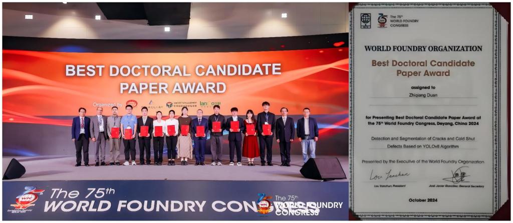 我院教育部共建铝镁材料研发应用协同创新中心赵宇宏教授团队10名师生应邀参会并做邀请报告。其中,博士生段志强的报告“Detection and segmentation of cracks and cold shut defects based on YOLOv8 algorithm”荣获第75届世界铸造大会最佳博士生论文奖。
