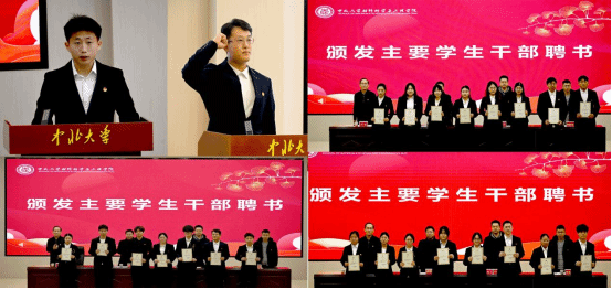 学生干部代表迟骋发言,感恩学院培养并承诺履职尽责、服务同学、搭建好学生与学院的桥梁。随后,在学生会主席刘利伟带领下,全体新任学生干部庄严宣誓,彰显新时代学生干部以身作则、勇于担当的精神风貌。