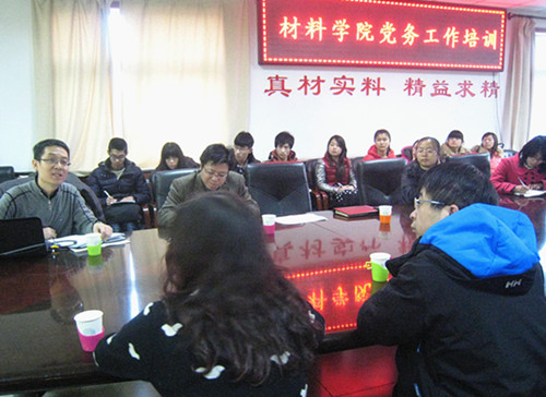 2014年12月16日下午,材料科学与工程学院党委在学院会议室举行党务工作培训。院党委书记侯华、副书记廖海洪出席会议并发表讲话。参加培训会的有学院教工党支部和学生党支部支部委员。培训会由院党委副书记廖海洪主持。