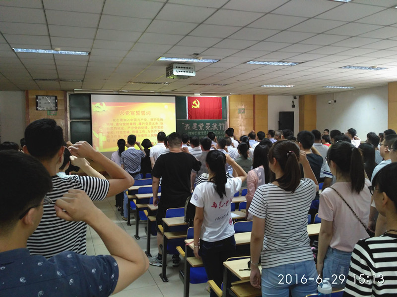 全体教师党员、2016届毕业生党员以及其他学生老党员重温入党誓词,本年度新发展党员也进行了庄严的入党宣誓。“佩戴党徽亮出身份,发挥先锋模范作用”环节:院党委委员为毕业生党员代表佩戴党徽,嘱咐毕业生党员谨记入党誓词,在今后的工作和学习中继续发挥先锋模范作用,做合格党员;毕业生党员代表为教师党员代表佩戴党徽,表达毕业生对母校的感恩,感谢老师四年辛勤培养与付出;党支部书记给本学期新发展党员佩戴党徽,希望成长为优秀中共党员。随后,党委委员冯再新宣读2015/2016年度学生党支部支委名单,党委委员给学生党支部支委代表颁发了聘书。教师党员代表孟模发言表达他将继续向优秀党员学习的志向,继续立足本职工作,为学院做出贡献。毕业生党员代表杨啸则表达了他对党员应该发挥作用的理解,将站好毕业生离校的最后一班岗。新党员代表李培真表达他将再接再厉,向优秀党员看齐的决心。