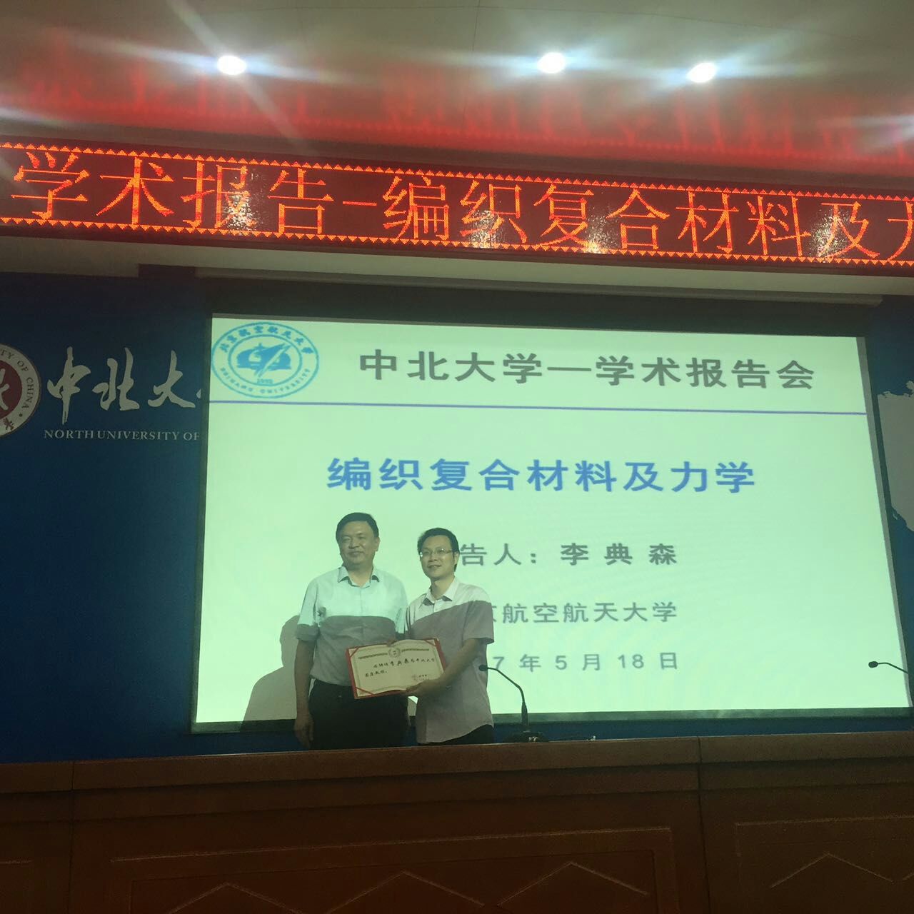 2017年5月18日下午,我院邀请李典森在瑾瑜国际会议中心做题目为“编织复合材料及力学”报告,报告由我院科研副院长冯再新主持。鉴于李典森研究员在复合材料领域的研究水平和所取得的研究成果,我校特聘其为我校的客座教授,由我校副校长赵贵哲教授为其颁发聘书。