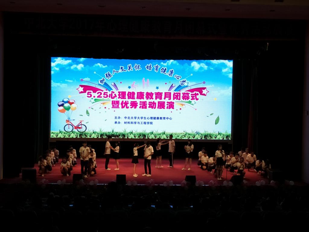 2017年5月31日晚,由中北大学大学生心理健康教育中心主办,材料科学与工程学院承办的5.25心理健康教育月闭幕式暨优秀活动展演在科艺院隆重举行。本次活动到场的嘉宾有校学生处处长邱建国,副处长顾宁,材料科学与工程学院团委书记毋登辉以及学生科郝小军老师。