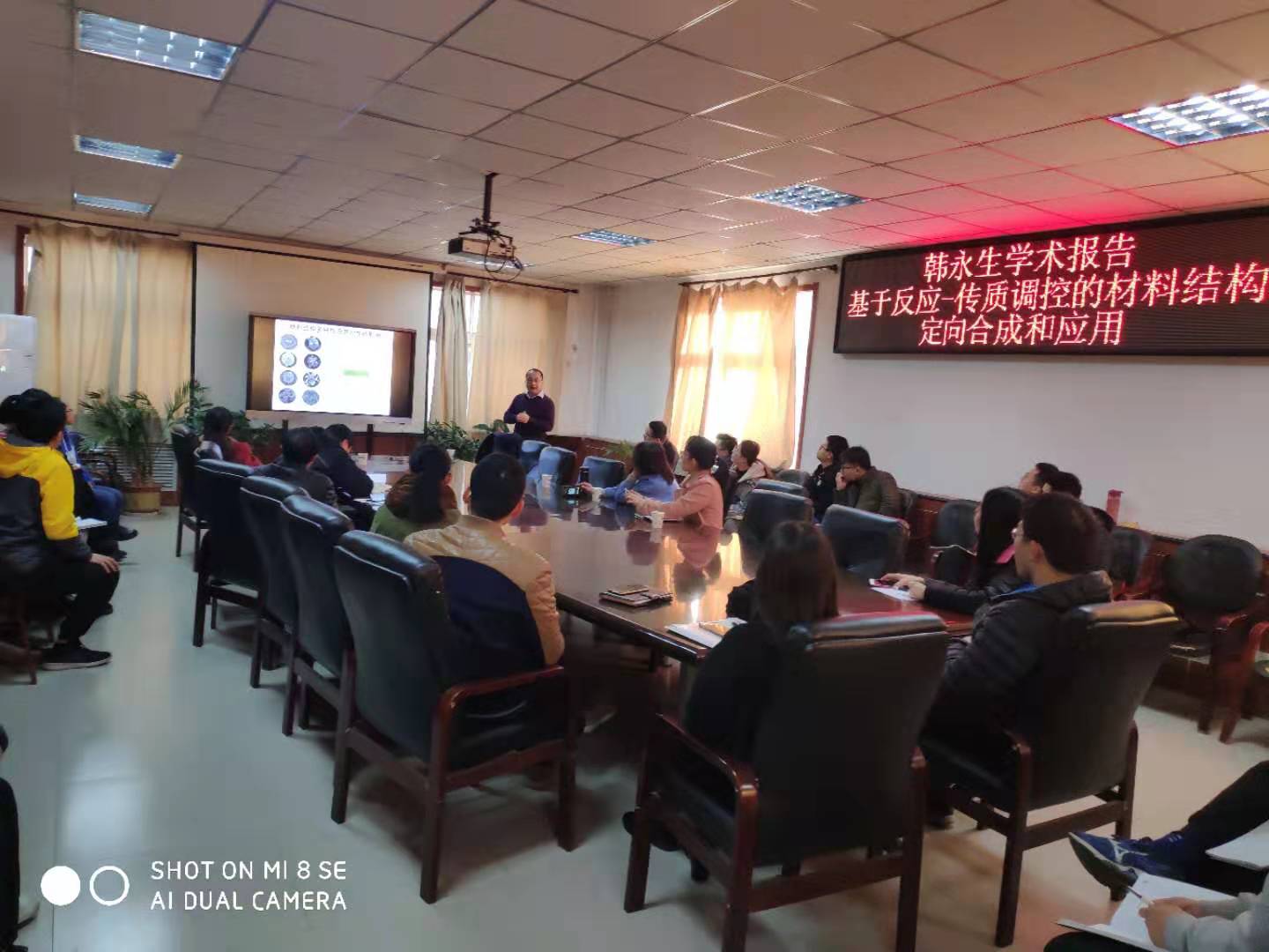 2019年11月15日,应中北大学材料科学与工程学院邀请,中国科学院过程工程研究所韩永生研究员来我校进行学术研讨和交流,并作了题为 “基于反应-传质调控的材料结构定向合成和应用” 的学术报告。