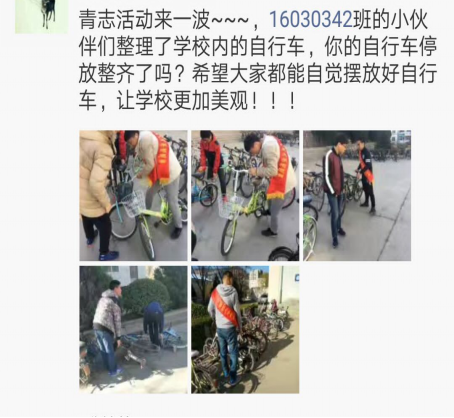 在主持人讲述了“醒春”志愿活动的意义,宣布答辩比赛开始后,第一个上台答辩的便是16030342团支部代表何鑫同学。何鑫同学先向大家展示了16030342团支部开展整理校内自行车“醒春”志愿活动的照片并讲述了整个活动流程、通过网络平台的宣传工作以及志愿活动参与人数比例等数据。最后又向大家讲述了16030342团支部此次志愿活动的意义。