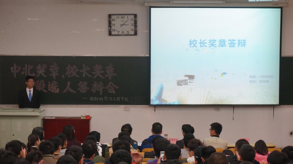 2017年11月9日下午2时30分,材料科学与工程学院中北奖章、校长奖章候选人答辩会在10101H教室如期举行。出席本次大会的有我院副院长刘斌、院团委书记毋登辉、学生科郝小军、贾越以及王敏老师。并由我院优秀学子韩国栋、焦杰彪担任评委。