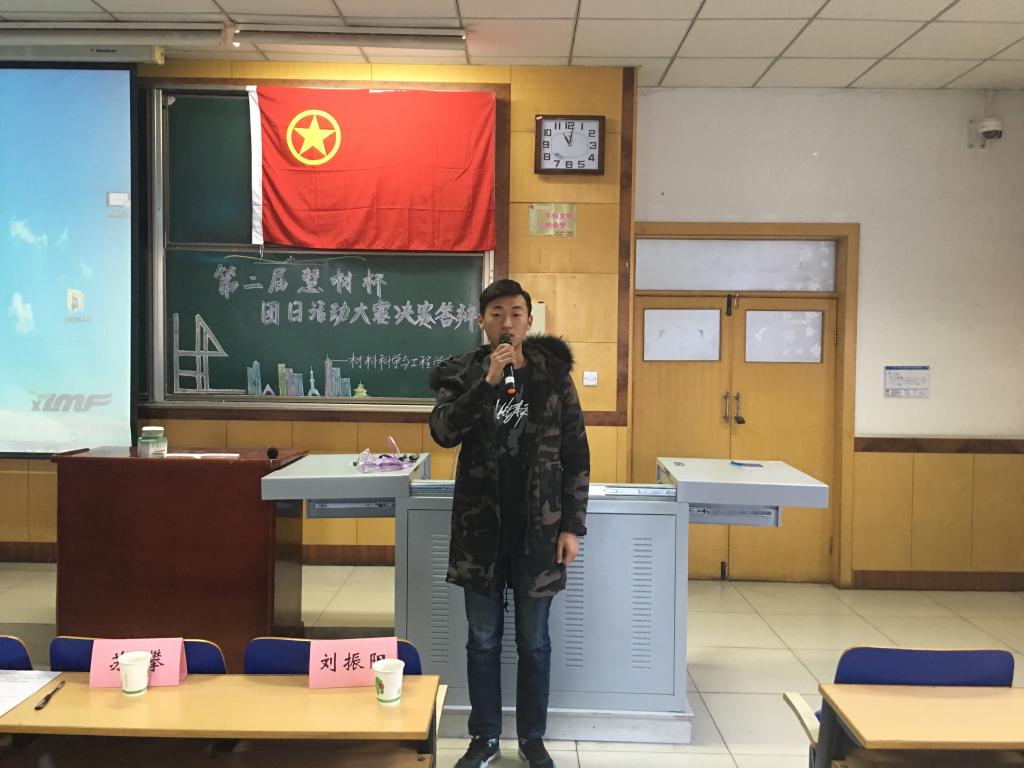 比赛开始,团歌的奏放让所有人肃然起敬,也让比赛正式拉开了帷幕,参加本次答辩的嘉宾有材料科学与工程学院团委副书记雷云超学长,材料科学与工程学院常务副主席段一杰学姐,以及我校材料科学与工程学院,信息与通信工程学院,大数据学院,人文社会科学学院,电气与控制工程学院的组织部长和我院其他各部门各部长。