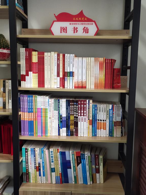 党支部在材学书屋打造复合材料与工程学生党支部图书角,为党支部同志和本专业学生提供学习场所和阅读书籍,让书本源源不断地循环利用下去,让广大同学从党史书籍中汲取智慧和力量,赓续红色血脉,同时从专业书籍中获取更多专业知识,让更多同学感受到党支部坚持为群众办实事的信心和决心。
