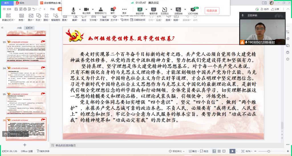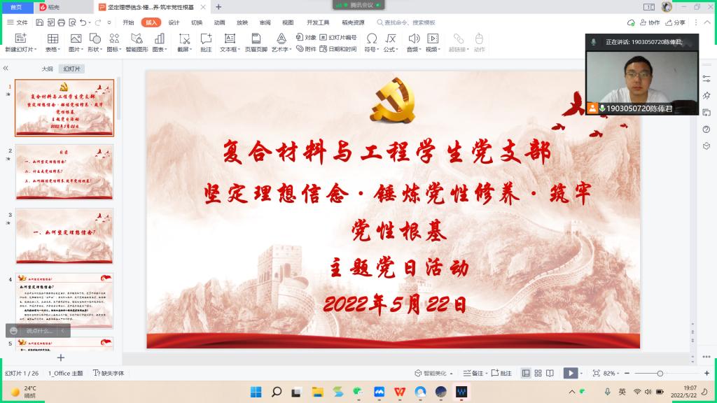 2022年5月22日,复合材料与工程学生党支部在腾讯会议召开坚定理想信念·锤炼党性修养·筑牢党性根基主题党日活动,支部副书记陈俸君同志以“坚定理想信念·锤炼党性修养·筑牢党性根基”为主题进行讲解。