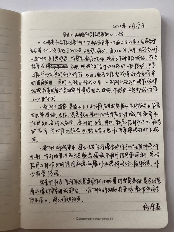 我们首先就条例的具体内容展开了学习,其中,条例规定公共信用信息应当通过依法公开、依职权查询、授权查询、实名认证查询等方式向社会开放;对于失信行为的认定,《条例》规定,部分具有法律效力的文书可以作为认定失信行为的依据,包括生效的司法裁判文书和仲裁文书;行政处罚、行政强制和行政裁决等行政行为决定文书;法律、法规或者国家有关规定规定的可以作为失信行为认定依据的其他文书。值得一提的是,《条例》规定县级以上人民政府应当制定促进信用服务业发展的政策措施,学校、有关职业培训机构等应当将诚信教育和信用知识纳入教学、培训的内容。同时,鼓励信用产品和服务的应用,并对信用服务机构业务开展和自身建设进行了规范。《条例》的制定将打破信用信息孤岛,健全守信激励和失信惩戒机制,充分发挥社会信用服务市场经济的功能,同时将该省行之有效的经验做法固化,高质量推进山西省社会信用体系建设。