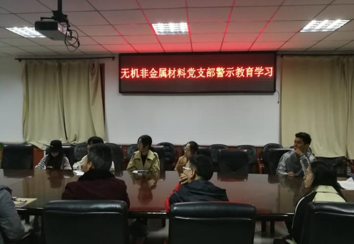 2019年10月12日,材料学院无机非金属材料学生党支部在院办会议室进行了支部内的廉政警示教育,以观看廉政警示教育片——《贪与悔》、总结违法违纪案件的形式,让支部成员从中汲取经验,引以为鉴,坚守廉政底线,深入贯彻“不忘初心、牢记使命”主题教育工作,切实增强纪律观念,严格执行纪律规定,以新担当新作为奋力开创事业发展新局面。
