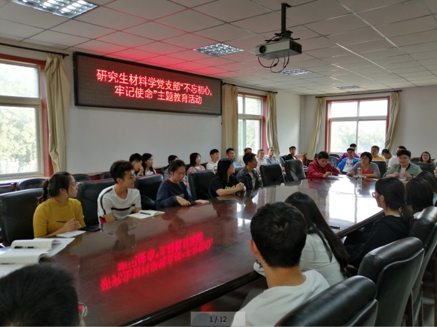 9月20日下午,研究生材料学党支部“不忘初心、牢记使命”主题教育的首场专题党课在材料学院第一会议室举行,支部全体党员、发展对象积极分子参加。党课以《不忘初心 牢记使命 做新时代的奋斗者》为题,由支部书记王燕讲授。