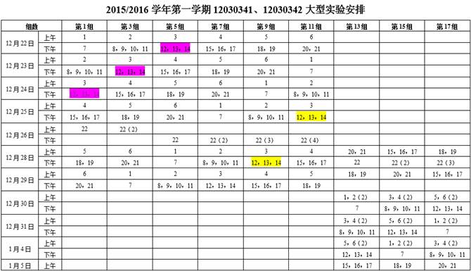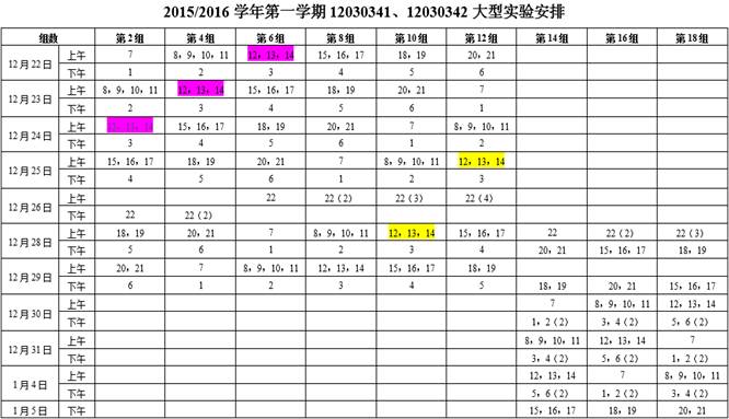 (3) 2015年12月21日-2015年12月29日为验证性、设计性实验。2015年12月30日-2016年1月8日为综合性实验,各小组提前找李迎春/柳学义老师预约。