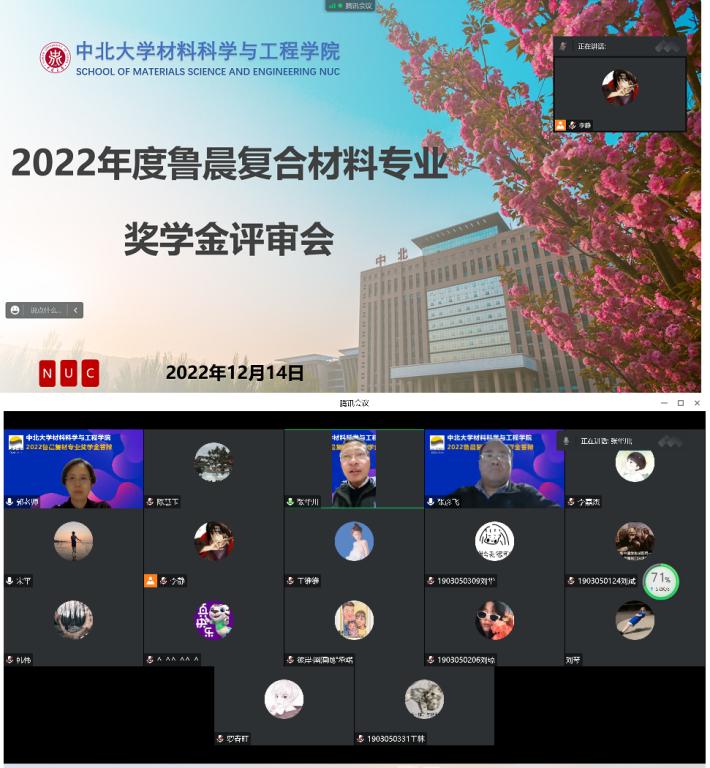 根据《鲁晨复合材料专业奖学金评选管理办法》文件精神,学院于2022年12月14日19时在腾讯会议进行了2022年度鲁晨复合材料专业奖学金评审会。参加本次评审工作的评委有:材料科学与工程学院院党委副书记郭云霞,成都鲁晨新材料科技有限公司技术总监张华川,复合材料与工程专业老师张彦飞、陈慧玉、宋平,学院辅导员老师贾越、韩伟、张维叶、褚嫱、刘琴、李静。