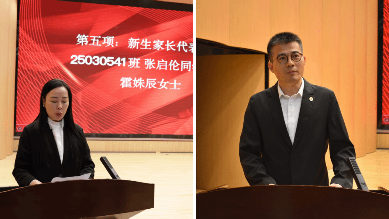 家长代表霍姝辰女士表达了对学校及学院的信任与感谢,并寄语全体新生要心怀感恩、独立自强、勤学笃行,希望孩子们在大学校园里健康成长、学有所成。