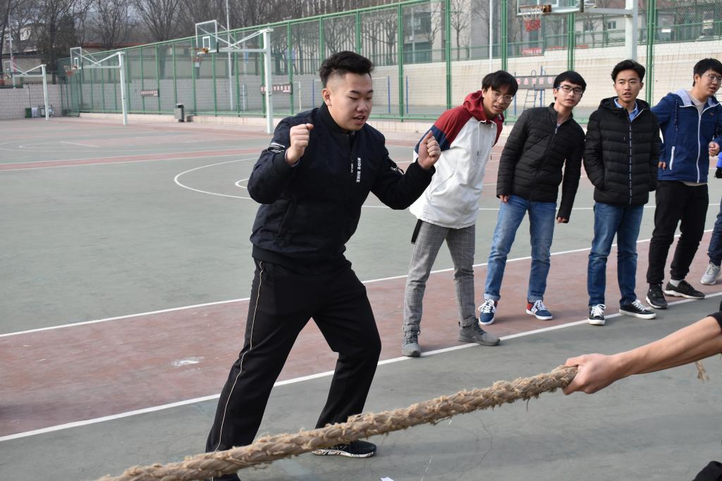 各班同学们积极做着赛前准备,并商量调整着战略。随着预备令下,同学们立即入场,双手像一把把铁钳子似的,紧紧地握住麻绳,迈开一大步,作好了准备。在场参赛的同学个个精神振奋,斗志昂扬。有的同学肌肉紧绷,筋脉突出,一会儿工夫脸上就渗出了汗珠,好多同学的手都被绳子勒得发红,他们还是咬紧牙关,忍着疼痛,一个劲儿地拉着。“加油!加油!”未参赛的同学自发组成啦啦队为比赛队员呐喊加油。比赛过程中,各班参赛队员努力拼搏,无论是场上还是场下,气氛都异常紧张,现场啦啦队的同学个个热情高涨,呐喊助威给比赛增添了一抹亮色,每一声呐喊都为参赛队伍注入了一股力量!