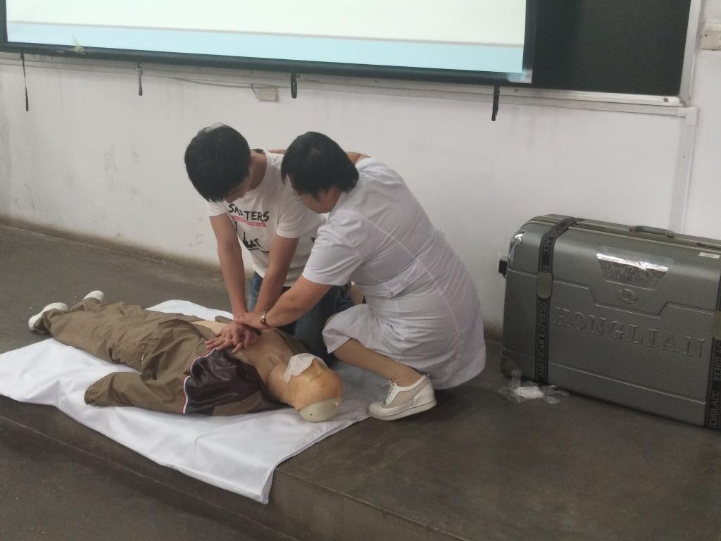 活动实践环节是由吴医师和尹医师共同向同学们演示如何在遇到突发事件时进行正确的心肺复苏。心肺复苏的步骤有判断意识、立即呼救、救护体位、打开气道、人工呼吸、胸外心脏挤压,医师现场给同学们做示范,并让同学们自己动手尝试,同学们也积极参与到其中,认真学习了心肺复苏的动作要领和基本步骤。
