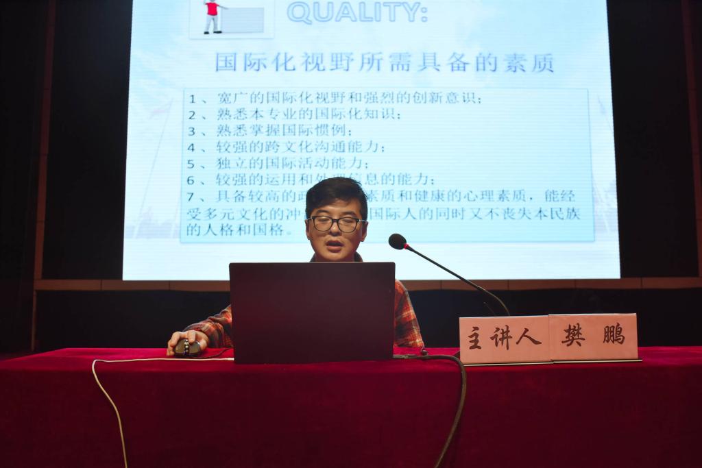 贾鹏老师讲座的主题是“追回流逝的刚健”。从学校近两学年健康测试情况引入主题,通过各项调查数据,剖析了体育教学的现状和体育强国的必然性。随后通过从社会学、心理学层面简析体育精神,以多个世界领袖的体育情怀为例,解释了国家重视体育运动的原因,深刻剖析体育强国的必然性。随后樊鹏老师为我院新生开阔国际化视野,提出国际化视野所应具备的七项素质,以及培养国际化视野的途径和走向国际化所必须具备的两个重要工具——通用语和学术英语。同时樊老师向同学们介绍了中北大学国际交流项目细则,为大一新生提出建议。