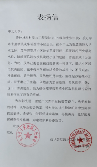 近日,安徽省无为市十里墩镇人民政府向材料学院发来表扬信,充分肯定我院2018级学生张中弢同学在当地抗洪救灾中的突出表现。