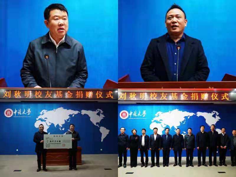 2021年4月13日下午14:30,刘秋明校友基金捐赠仪式于中北大学瑾瑜国际会议中心举行,我校杰出校友、深圳春图科技、卢可丝集团董事长刘秋明向中北大学捐款一千万元人民币。出席此次活动的嘉宾和领导有杰出校友刘秋明、校党委书记沈兴全、校党委副书记雷锋斌、副校长刘俊、党办校办主任叶玉刚、校友办主任张胜利、材料学院党委书记薛亚奎、材料学院院长侯华等。