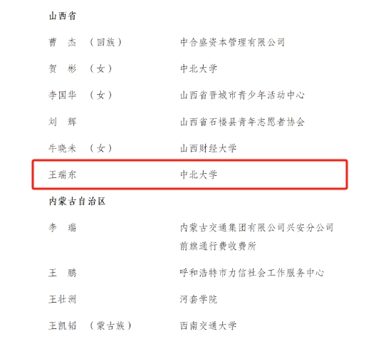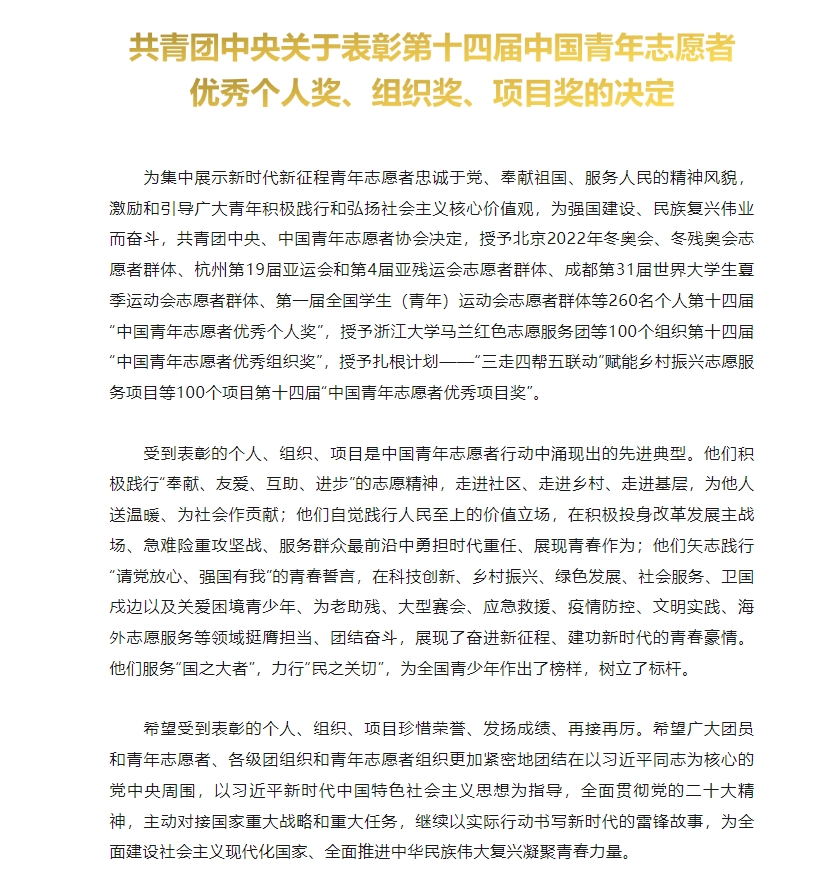 近日,共青团中央、中国青年志愿者协会决定,授予北京2022年冬奥会、冬残奥会志愿者群体、杭州第19届亚运会和第4届亚残运会志愿者群体、成都第31届世界大学生夏季运动会志愿者群体、第一届全国学生(青年)运动会志愿者群体等260名个人第十四届“中国青年志愿者优秀个人奖”,我院王瑞东同学获奖。